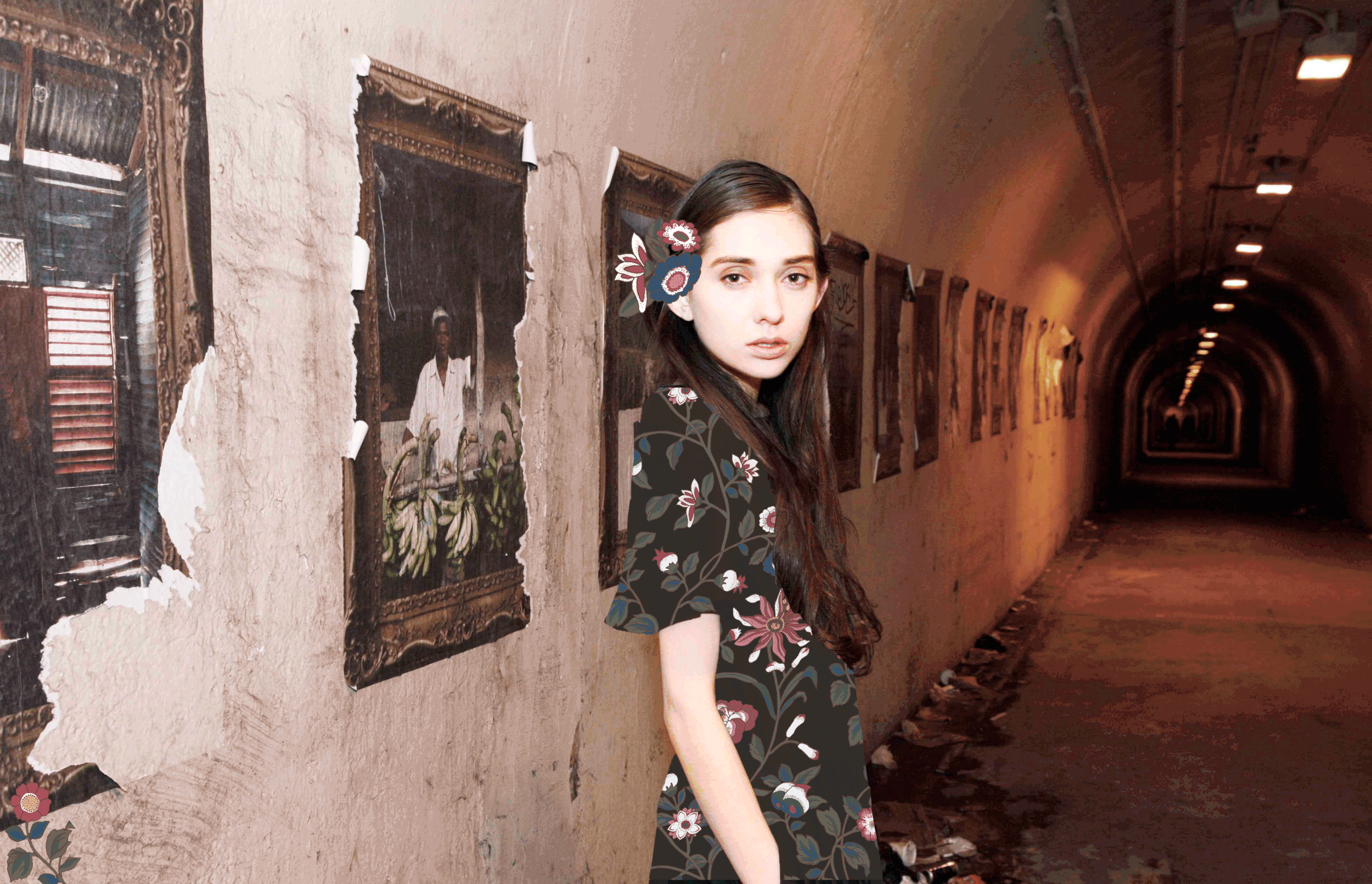 Layering over our mini floral print on a photograph of a girl selling roadside flowers, interconnect the 70's vibe and the current moment today.