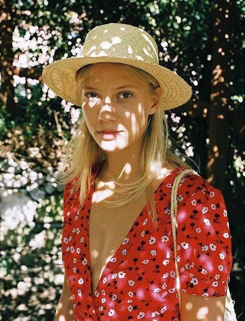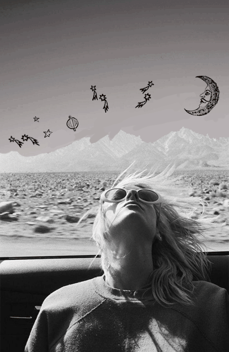 Sky and stars, a romantic conversational print has been layered over a photo of Jenny Parry photographed by Jason Lee Parry for Free People.